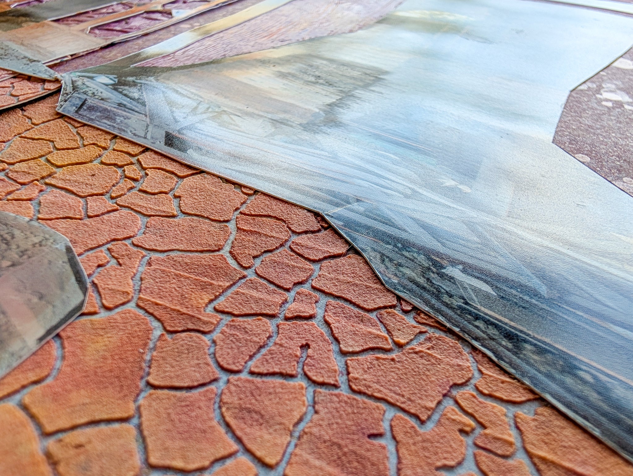 Digital image on lustre paper with handmade inked paper, acrylic paint, mediums and varnish