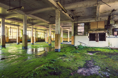 ‘Reclamation’ focuses on nature’s triumph as plants, trees, moss and mould regain spaces. The absence of human life is profoundly felt in industrial, institutional and often solitary environments. At the heart of this series is a duality between architectural prowess and the fallacy that humankind has any permanent control over nature.